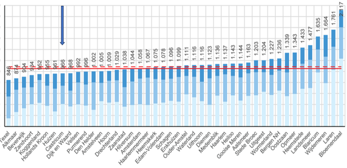 € 932 plaats 10. In de benchmark 2025 hieronder, is de positie van Castricum met een pijl aangegeven.